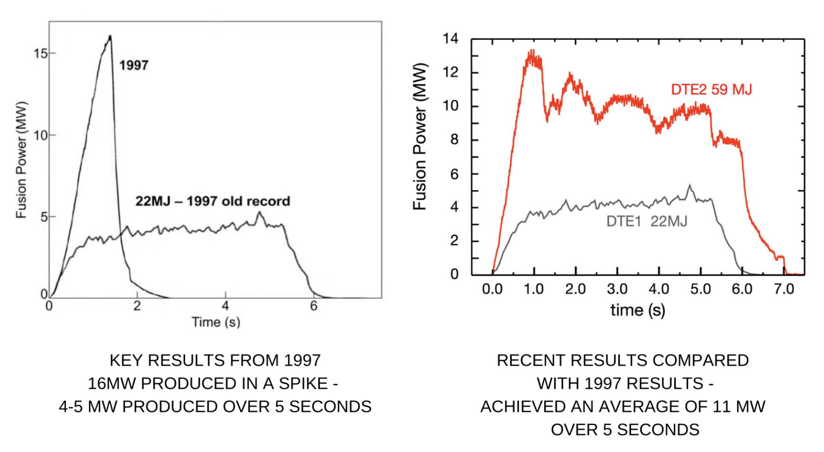 This builds on a past deuterium-tritium (DT) campaign from 1997. Whilst they haven't exceed the peak fusion power produced (16 megawatts (MW) in 1997, average of 11MW today) or the scientific Q value (the ratio of energy out to energy in, 0.7 in 1997, 0.33 today) they have doubled the fusion power produced in a sustained 5-second pulse.
