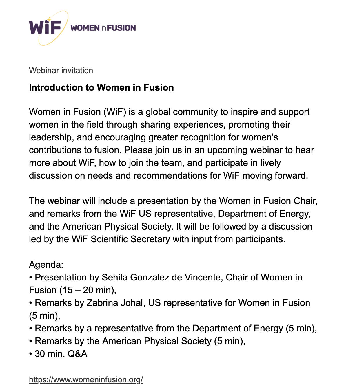 At Fusion Power Associates 43rd Annual Meeting and Symposium in December 2022, Sehila Gonzalez de Vincente, Chair of Women in Fusion, made a presentation on the group's progress. Her presentation can be accessed at https://fusionpower.org and click on Annual Meetings and Symposia.