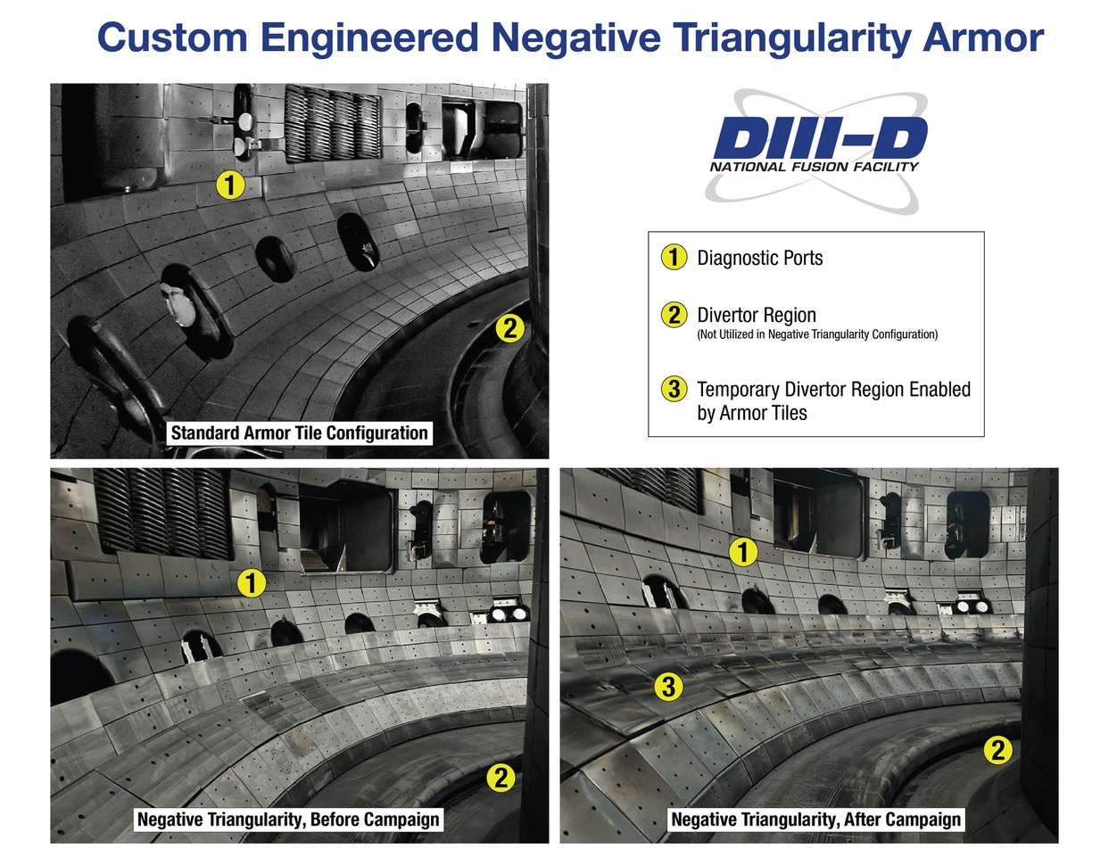Because negative triangularity plasmas place heat exhaust outside of the installed divertor region, DIII-D's interior required a special modification. To enable the research campaign at DIII-D, the research team completed an engineering project to design and install special armor tiles to provide sufficient protection and create a temporary divertor region (Figure 2).