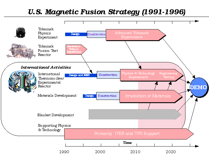 Following guidance from Congress, the US fusion program began to restructure its strategy, content, and objectives by emphasizing fusion science, concept improvement, and alternative approaches, including inertial fusion, while maintaining its effort on low-activation materials development. The new strategy also had to consider international cooperation as the means of building major new facilities.
