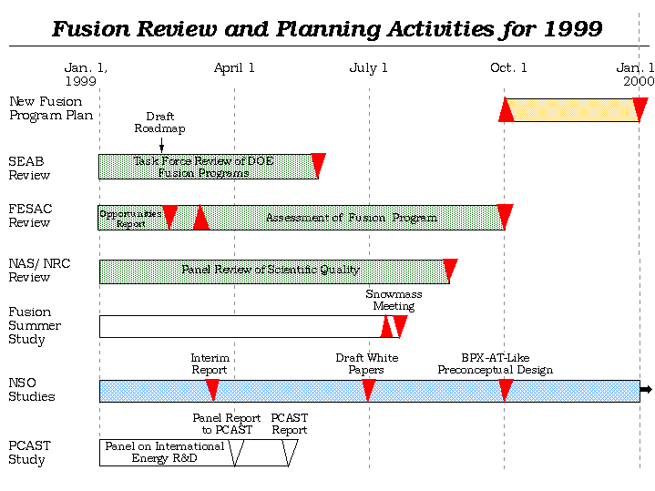 The review and planning activities of 1999 will address both sides of the dual nature of the program: science and energy. There will undoubtedly be strenuous tension created in the process. However, it is important to the health of the fusion program that a broad consensus be forged on a strategy for moving fusion research forward in cost-effective steps. Divisiveness will not serve the program well at this juncture, and I am pleased by the collaborative approach the community leaders are taking in preparing for these activities.
