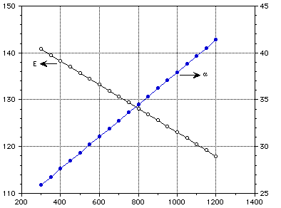 Figure 2: Elastic modulus and thermal expansion coefficient of lithium oxide as a function of temperature.